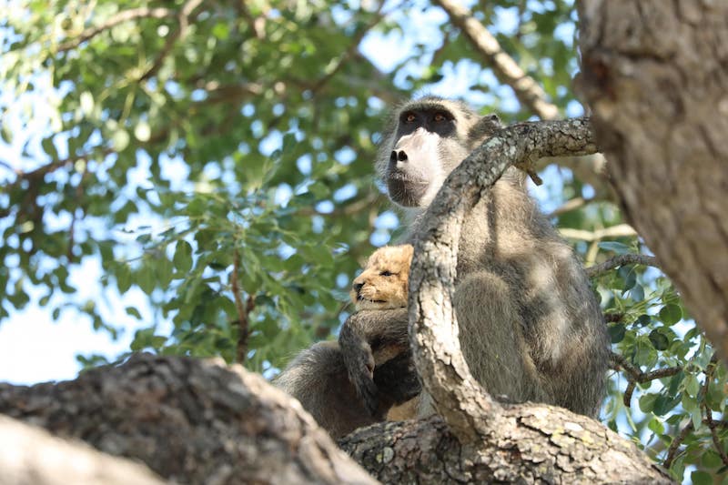 Il est rare de voir un babouin mâle portant et toilettant un lionceau. Pourtant, cela s’est passé le week-end dernier dans le parc national Kruger d’Afrique du Sud.